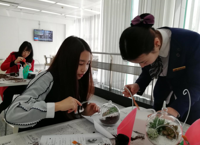 项目的工作人员简明扼要的讲解了多肉栽种要点与工具使用方法后,与大家一起动手进行种植,看起来小小多肉,可急坏了不少的女神们,“为什么我的多肉摇摇晃晃”“我的多肉怎么放不进去”等等,“小老师”们耐心的为每一女神进行讲解,时而亲自动手示范;现场气氛顿时热闹极了,妙趣横生,欢声笑语不断。