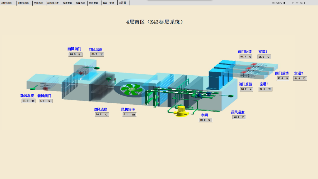 第一阶段是对空调末端的改造。针对风平衡失调的问题,在空调机组风机上加装变频器,使空调机组风机的运行不再局限于高低两速,风量和风压可以无级调节。同时,为了调节的方便,将空调机组每个分区的风阀都改为了电动阀。在空调机组的进出口安装了温度传感器。通过第一阶段的改造,解决了风量失衡的问题,也方便了对风量进行调节,改造后的空调机组状况如下图:
