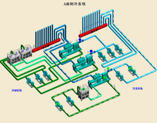 第二阶段是对整个空调系统控制方式的改造。改造的重点是在冷热源系统上加装各类传感器(主要有温度、压力、压差、流量等),并将冷热源设备和末端机组的控制集中到一个值班室,实现所有空调设备的远程控制。因为加装了大量传感器,设备的运行状态在集中控制屏上能直观的看到,从而减少了远程操作的盲目性。通过控制方式的改造,运行人员的工作量大大减少了,也实现了一定程度的节能。下图是制冷系统运行的画面,在控制屏上点击任一台设备,可以对设备进行操作。