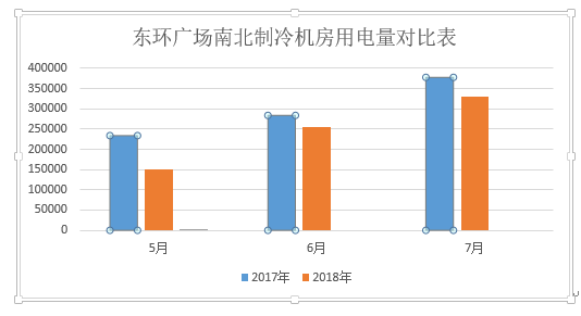 以下是从东环广场能源管理平台上调取的东环广场南北两个制冷机房在5、6、7三个月的用电数据: