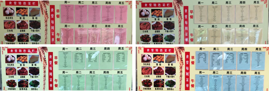 为了在细节方面提升服务,我们将食堂每周菜单公示栏按照一个月四种颜色轮流摆放,粉红色代表了每月第一周上班时开始忙碌的状态,黄色代表了第二周平稳和谐工作的状态,绿色和蓝色均代表了明朗轻松的工作状态。