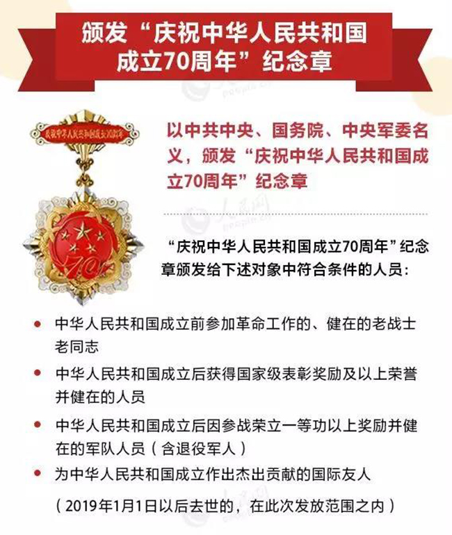 据新华社报道,颁发“庆祝中华人民共和国成立70周年”纪念章是新中国成立70周年系列庆祝活动的重要组成部分,对于加强爱国主义教育,培育和践行社会主义核心价值观,增强中国特色社会主义伟大事业凝聚力和感召力,具有十分重要的意义。