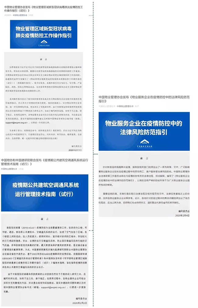 1月28日,农历正月初四,为落实党中央和国务院的指示精神,指导和帮助全国物业服务企业全力做好物业管理区域新型冠状病毒肺炎疫情防控工作,中国物协迅速组织业内部分资深专家成立编写委员会,编撰了《物业管理区域新型冠状病毒肺炎疫情防控工作操作指引(试行)》。《操作指引》共分为住宅、写字楼、产业园区、高校、医院五类物业业态。自2月1日以来,相继在中国物协微信公众号发布。之后,又编撰发布了《物业服务企业在疫情防控中的法律风险防范指引》与《新型冠状病毒肺炎疫情适用法律法规汇编》。同时,为防止因空调通风系统引起的空气流通而导致新型冠状病毒的扩散,中国物协设施设备技术委员会联合中国建研院建筑环境与能源研究院编制和发布了《疫情期公共建筑空调通风系统运行管理技术指南(试行)》,指导疫情防控期间各类公共建筑空调通风系统的安全运行。该系列操作指引文件共计近60多万字,结合了相关疾控指导和各地及有关物业服务企业实践中积累的有效经验和做法,在已有关于疫情防控相关制度、规范的基础上,结合物业管理行业实际,进一步完善细化,更加突出了实践指导性。