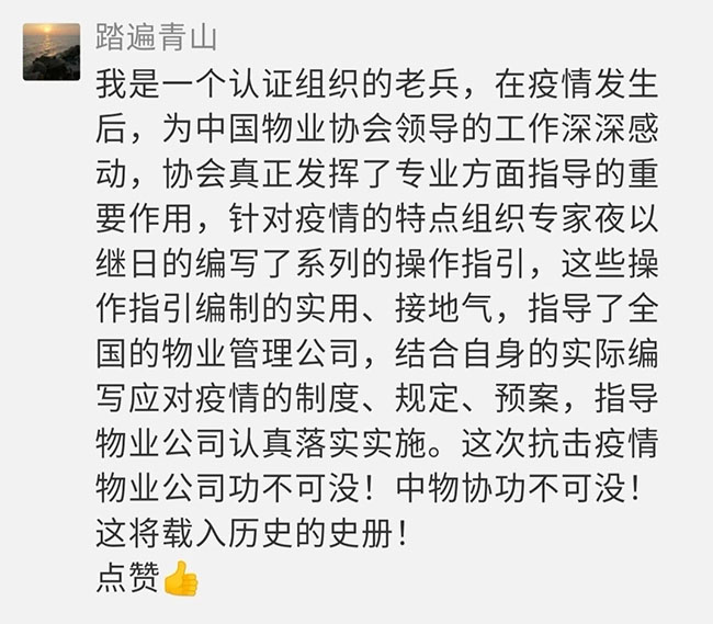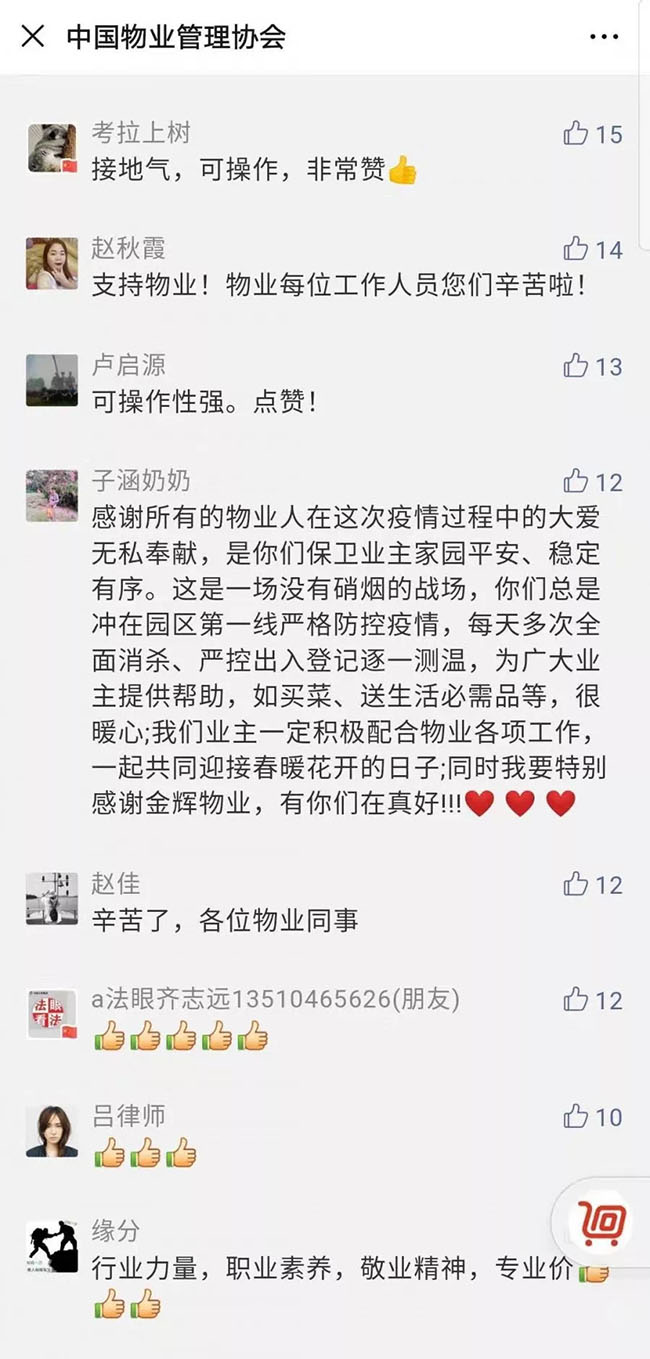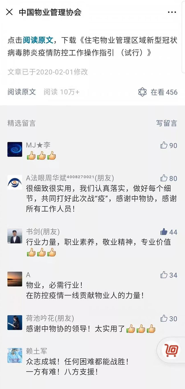 “全面细致地把此次疫情防控工作的重点、难点、特点、程序和要求说得一目了然,很有实用性和指导性,让我们物业人对战胜疫情的信心更加强大了!”“中国物协真正发挥了专业方面指导的重要作用,组织专家夜以继日地编写了系列操作指引,指导和帮助全国的物业服务企业结合自身的实际编写应对疫情的制度、规定、预案。”……近日,中国物业管理协会发布的《物业管理区域新型冠状病毒肺炎疫情防控工作操作指引(试行)》(简称《操作指引》),在微信平台上吸引了近50万人关注,阅读近60万次,网友纷纷留言和点赞。
